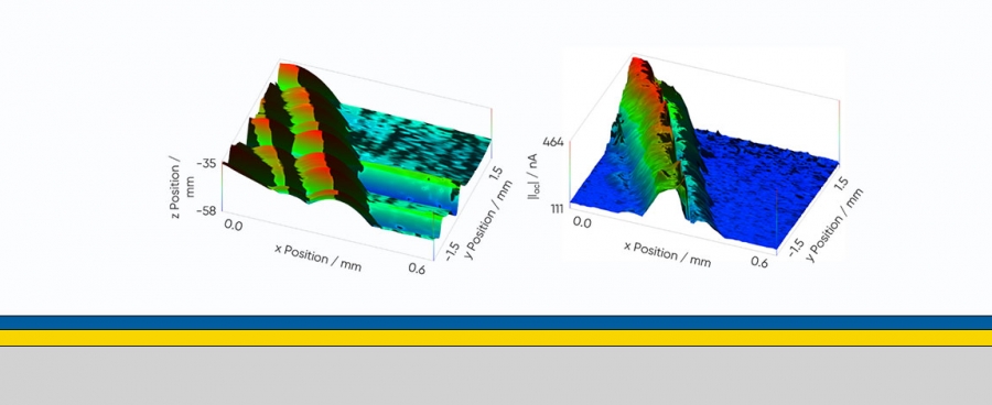 Рисунок 3: ic-ac-SECM использовали для измерения искусственной царапины на внутреннем покрытии банки из-под напитков в водопроводной воде. Использовали частоту переменного тока 100 кГц, смещение переменного тока 100 мВ и смещение постоянного тока 0 В относительно OCP. На карте слева показана топография образца, а на карте справа показана величина переменного тока.