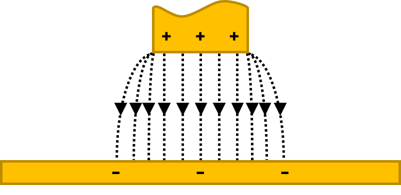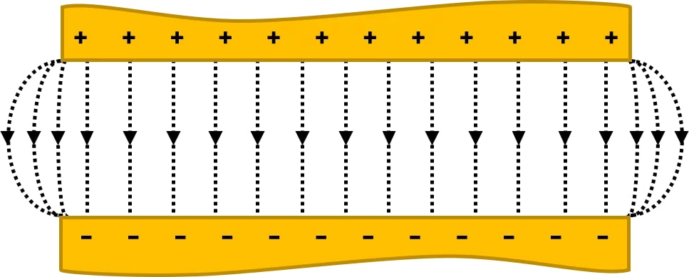 Появление эффекта окантовки характерно для конденсаторов конечной длины. Между двумя электродами существует однородное электрическое поле, однако по краям электродов поле становится неоднородным и распространяется в окружающее пространство. В этот момент видно, что электрическое поле изгибается за краями электродов. Именно это расширение электрического поля за пределы краев электродов называется окантовкой. Окантовка параллельного пластинчатого конденсатора показана на рисунке ниже. Это упрощенная иллюстрация, показывающая окантовку только параллельных поверхностей, как это было бы в датчике SKP, где соблюдается осторожность, чтобы не создавать электрическое поле по бокам датчика.