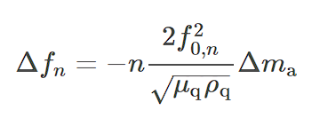 Где Δfn − изменение резонансной частоты на n−й гармонике в Гц, n − порядок гармоник, f0,n - резонансная частота на n-й гармонике в Гц, µq - модуль упругости кварца при сдвиге в кгм-1s-1 или Pas, pq - плотность кварца в кгм-3, и Δma − общая масса пленки в килограммах-2.