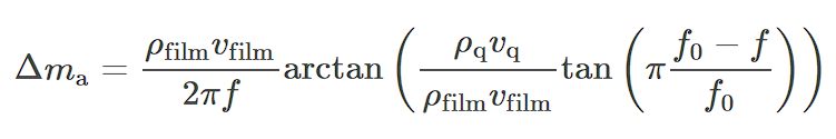 Где Δma − площадь пленки в кгм−2, pfilm и pq − плотность пленки и кварца, соответственно, в кгм-3, vfilm и vq - скорость распространения волны в пленке и кварце, соответственно, в мс-1, f0 и f - резонансная частота кварца. и композитный резонатор кварц+пленка в Гц.