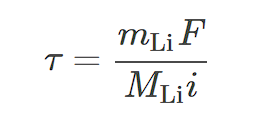 Предполагая, что окисление анода происходит с помощью процесса, показанного в уравнении (1), время перехода τ зависит только от массы электрода mLi, которая определяет заряд, необходимый для полного окисления анода, и приложенного тока. Если мы определим заряд и ток по единице площади, Q и i, соответственно, то получим: