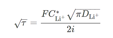 Предполагая, что восстановление Li+ происходит с помощью процесса, показанного в уравнении (2), время перехода τ теперь можно рассчитать по уравнению Сэнда: