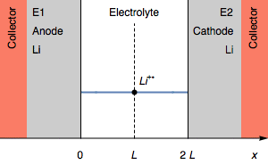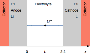 Тем не менее, в случае, когда I>0, быстрое увеличение потенциала также может соответствовать полному истощению Li+ (CLi+=0) на границе раздела электролит|Li на катоде. Это показано на рисунке 3.