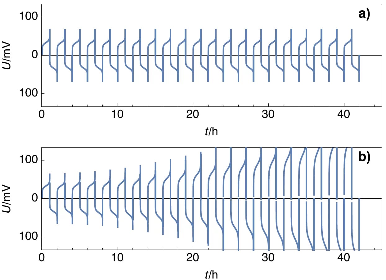 Симметричные ячейки являются простым и практичным способом проверки стабильности электродов при гальваностатическом циклировании. В случае Li окисление может привести к разрушению поверхности, а осаждение металла (восстановление Li+) может привести к образованию дендритов. На рисунке 4a показана характеристика напряжения стабильного элемента и стабильных электродов, где амплитуды напряжения не меняются со временем, а на рисунке 4b показана характеристика напряжения нестабильного элемента, состоящего из нестабильных электродов, где амплитуды потенциала меняются со временем.