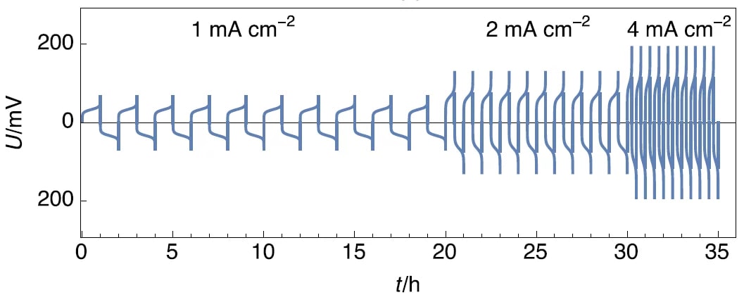 Рисунок 5: Хронопотенциометрия, выполненная с увеличением плотности тока, адаптирована по рисунку 3 в.