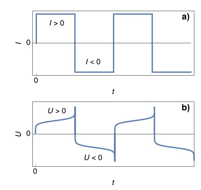 Рисунок 1: Схема а) изменения гальваностатического тока и б) характеристики напряжения для симметричного литий-Литий элемента. U=E1−E2.